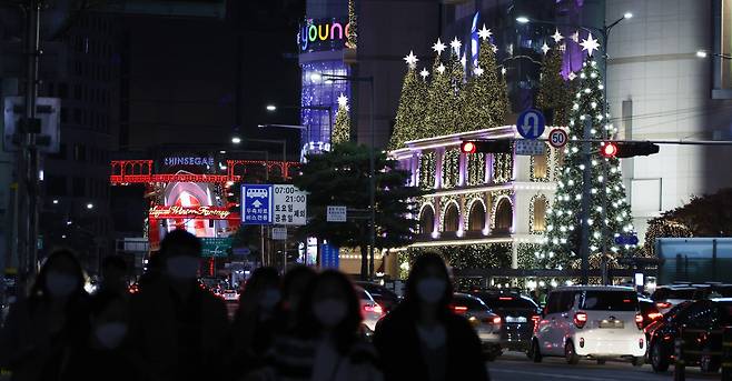 | ▲ 20일 중구 신세계백화점 본점과 롯데백화점 외벽에 성탄절로 꾸민 불빛이 나오고 있다. |
