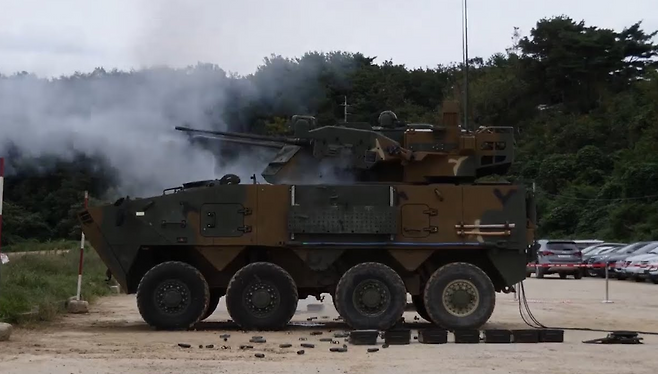 기존 궤도형 K-30 비호의 30mm 쌍열 기관포 화력은 그대로 유지하면서, 차체를 현대로템 K808 백호 차륜형 장갑차로 바꿨죠.