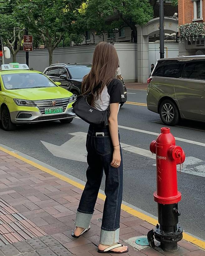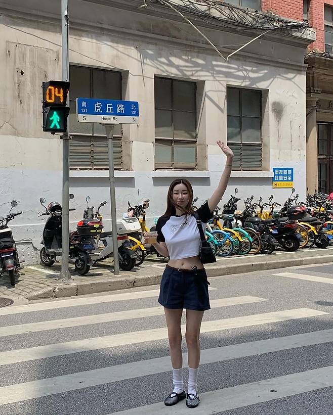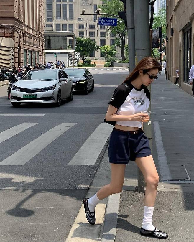 사진 속 차정원은 나그랑 크롭 반팔티를 입고 블랙 숏팬츠를 입었다. 흰 양말과 플래슈즈를 신고 숄더백을 코디하여 데일리룩을 선보였다.