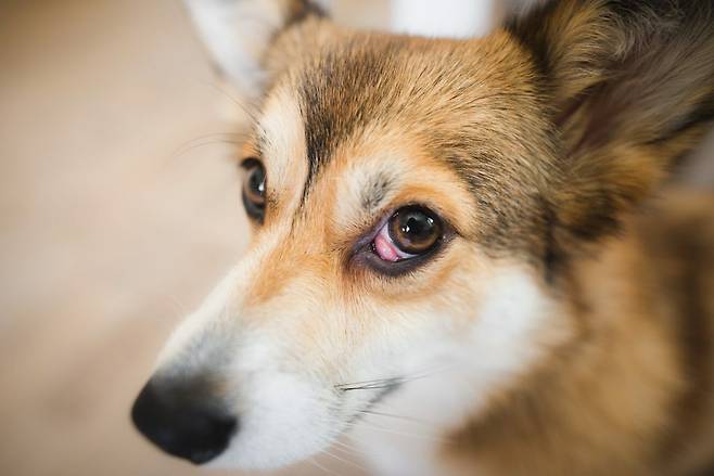 사람은 눈꺼풀이 눈 위, 아래에 2개가 있는데, 강아지는 눈 앞머리 안쪽까지 총 3개의 눈꺼풀이 있습니다. 이 눈꺼풀을 제3안검 혹은 순막이라고 부르는데요. 제3안검은 눈을 이물질과 상처로부터 보호하는 보호막 역할을 합니다. 또, 강아지 눈물 분비량의 30~50%를 담당해 눈을 건조하지 않게 만들어주는 중요한 부위이기도 합니다.