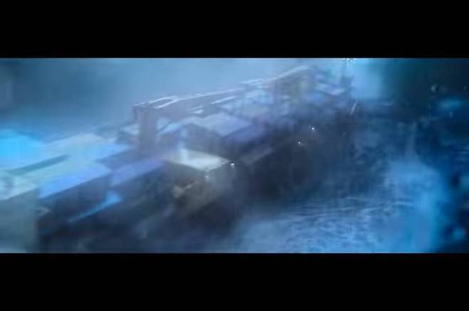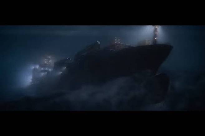 비바람과 폭풍해일로 인해 화물선이 흔들리고