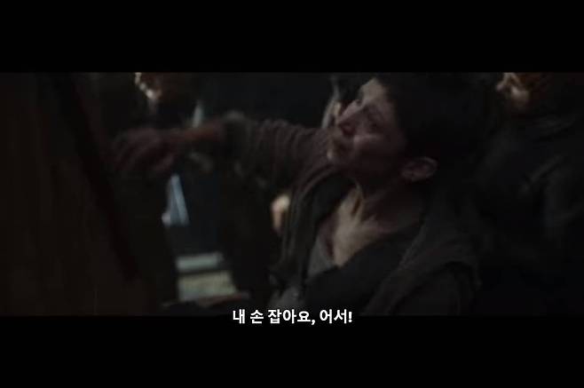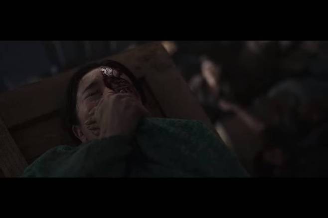 시체들 사이에서 금방이라도 울 것 같은 표정으로