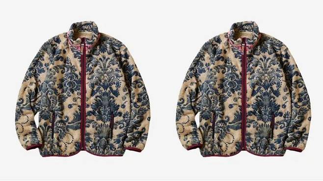 상의는 캐피탈(Capital) 브랜드의 ‘Kapital Damask Pattern Maria Fleece Zip Blouson Beige’ 재킷으로, 앞쪽 지퍼가 있으며 목까지 올라오는 디자인이다. 두꺼운 보아 플리스 소재로 제작돼 보온성이 뛰어나고, 부드러운 소재감과 포근한 핏이 특징이다.