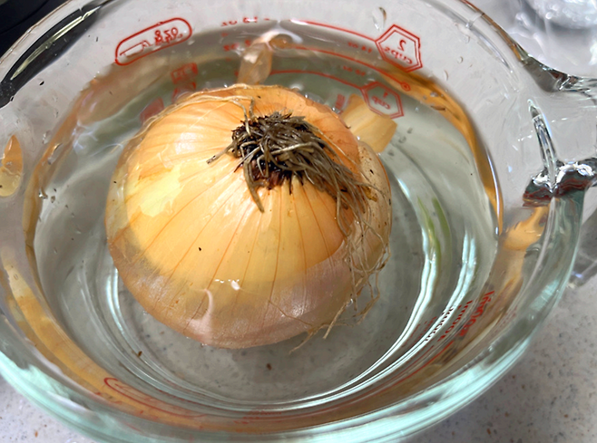 양파를 물에 담가 놓은 후 껍질을 까는 것도 방법입니다. 양파의 매운 성분은 물과 만나면 녹는 성질이 있어 물에 담가 놓으면 매운기가 빠진다고 합니다.