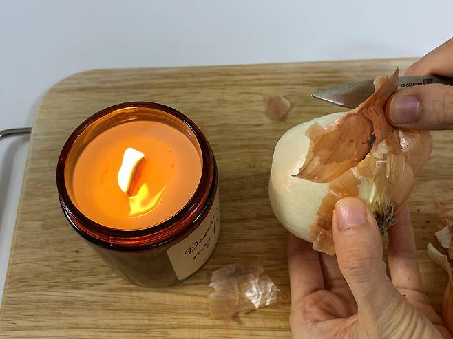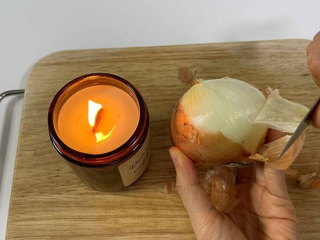 두 번째 방법은 양파 깔 때 초를 옆에 켜두는 것입니다. 양파 껍질을 벗길 때 촛불에 불을 붙여서 켜보세요.