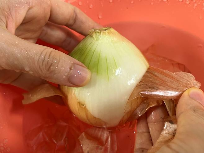 더 확실한 방법은 물속에서 아예 껍질을 까는 것입니다. 물에 담근 채로 양파의 껍질을 까면 매운 성분이 공중에 퍼지는 것을 막아줍니다.