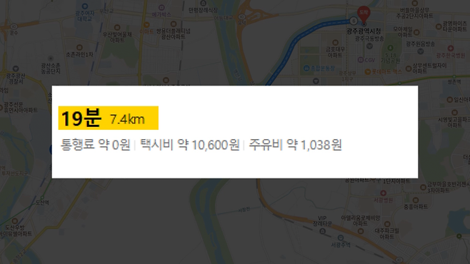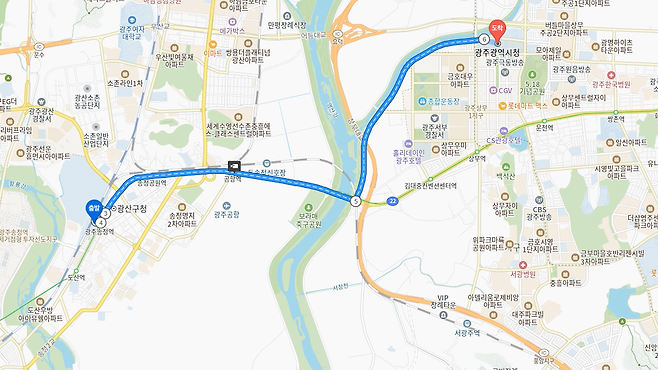 이 지도를 보라. 광주 시내에서 광주송정역(KTX)은 차로 약 20~30분, 거리로는 8km 정도 떨어져 있다. 이처럼 우리나라 곳곳에 KTX 정차역이 도심과 떨어져 있는 경우가 있는데.
