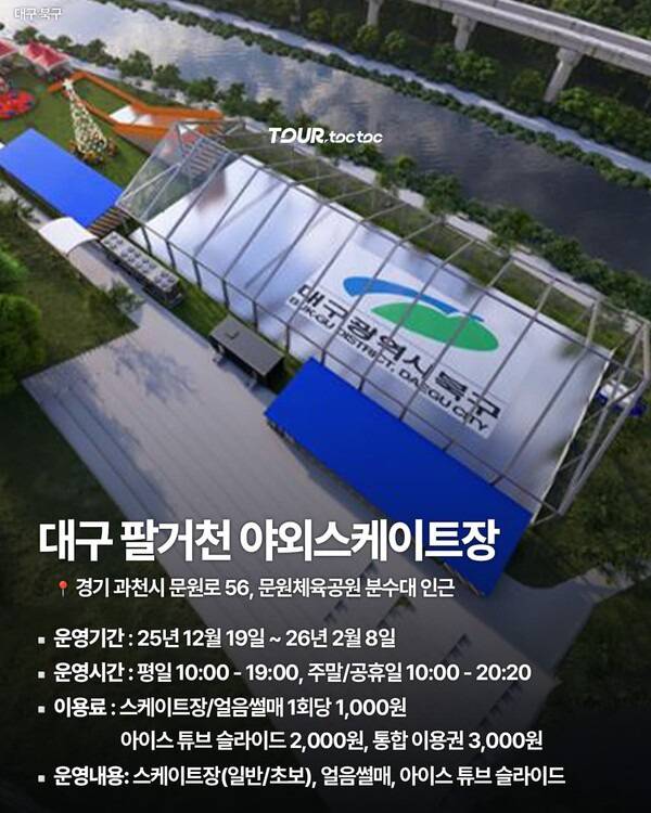 대구 팔거천 야외스케이트장은 일반 스케이팅 외에도 얼음썰매, 아이스튜브 슬라이드까지 갖추고 있어 풍성한 겨울 레저를 경험할 수 있습니다.