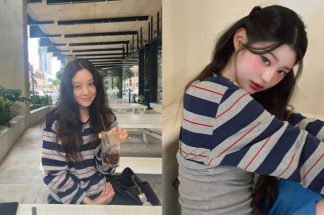 반면 장원영은 같은 티셔츠에 그레이 튜브탑을 덧입고, 컬러감 있는 아이템을 더해 팝한 무드를 강조했다.