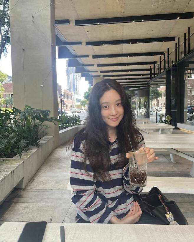 정려원은 이 티셔츠에 화이트 미디 스커트와 그레이 니삭스를 매치해 미우미우 특유의 소녀 감성과 성숙한 여유를 동시에 표현했다.