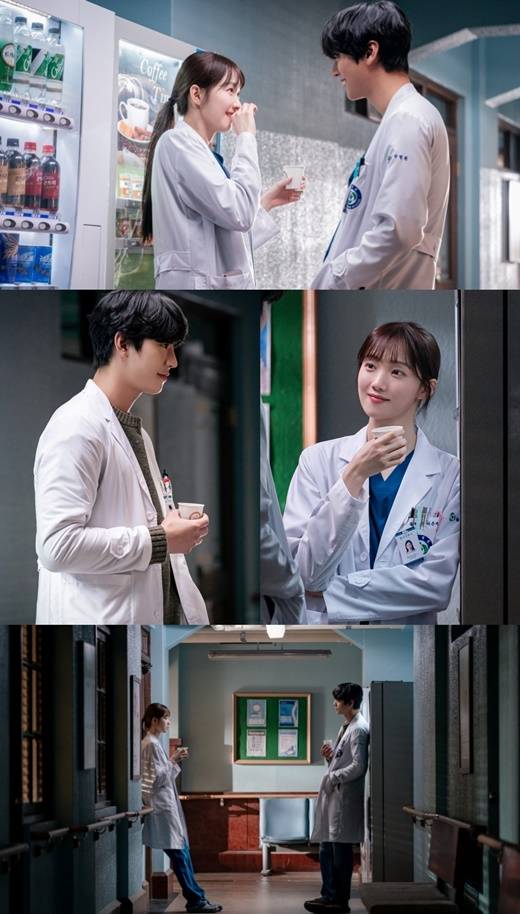 공개된 스틸컷에는 바쁜 돌담병원 안에서 막간 휴식을 취하는 서우진과 차은재의 일상이 담겨 있어 눈길을 끈다. 자판기에서 뽑아 먹는 밀크커피는 두 사람에게 추억이 깃든 아이템. 자판기 앞도 로맨스 장소로 만들어버린 3년차 커플의 낭만 기운이 보는 이들의 마음까지 설레게 만든다.