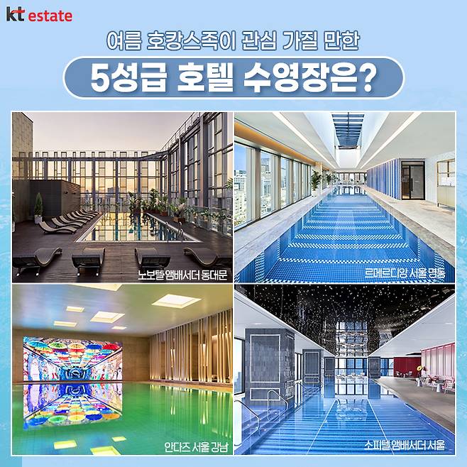 올해 호캉스족이 관심 있어 할 만한 수영장 호텔 중에서는 7월 1일, 개관 5주년을 맞이한 노보텔 앰배서더 동대문이 있습니다. 노보텔 앰배서더 동대문은 실내 및 루프탑 수영장 총 2개의 수영장을 갖추고 있는데요. 20층에 자리한 실내 수영장은 자동 수온 및 자동 정수 시스템이 있어 쾌적하며, 루프탑 수영장에서 남산타워, DDP 등 파노라마처럼 펼쳐진 도심 전망 속에서 낭만을 만끽할 수 있습니다.