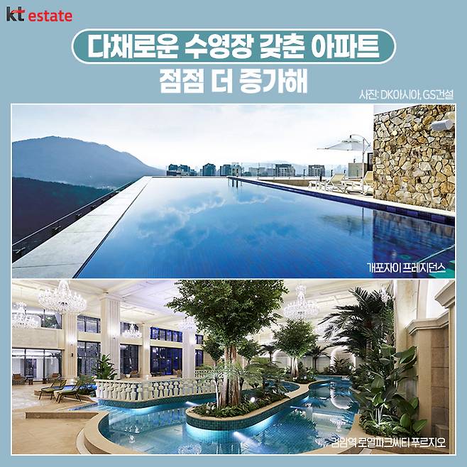 그중에서도 최근에는 수영장을 갖춘 아파트가 분양시장에서 실수요자 등으로부터 높은 관심을 받고 있습니다. 이들 수영장은 작게는 어린이 물놀이장부터 실내 수영장, 인피니티풀까지 다양한 형태로 구현되는데요.