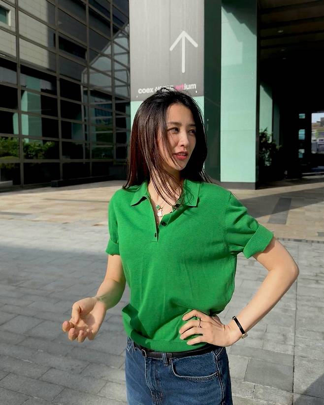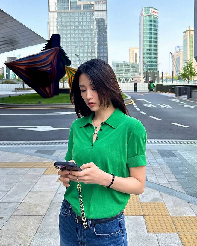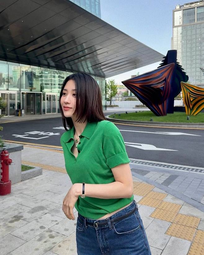 비비드한 초록 컬러의 니트 폴로셔츠는 얼굴 톤을 화사하게 밝혀주면서도,자연스럽게 실루엣을 드러내 세련된 인상을 완성해줬고요.