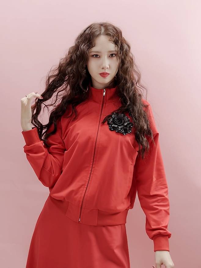 공개한 사진에서 윤아는 뽀글뽀글 웨이브 머리에 강렬한 레드 컬러의 집업 블루종 재킷과 플레이 스커트를 매치한 셋업을 입고 고혹적인 카리스마와 세련된 뉴트로 무드를 동시에 연출했다.