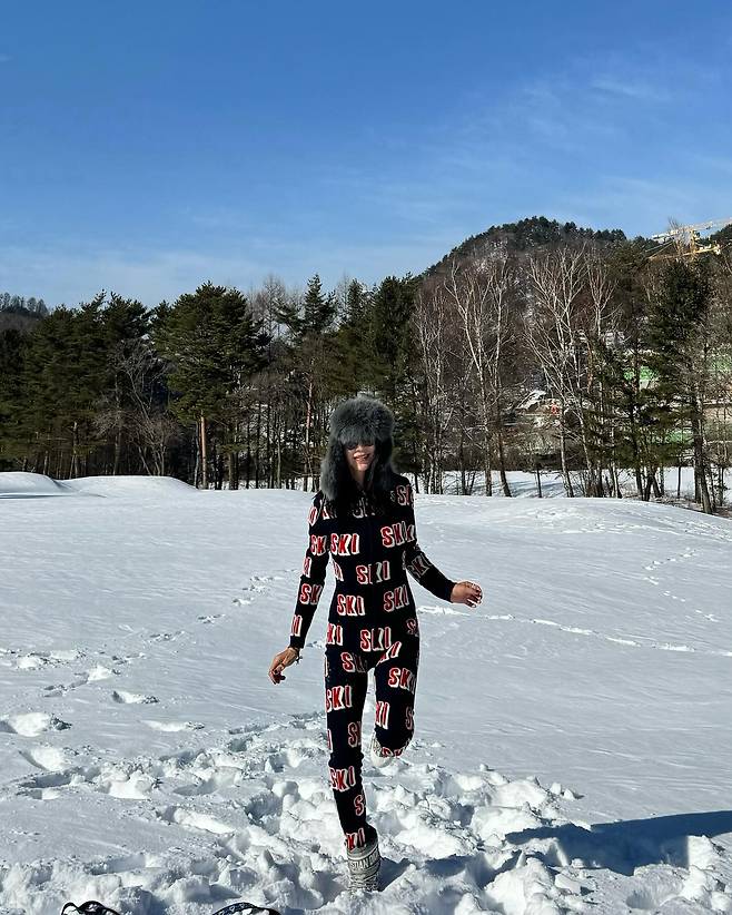 눈이 소복한 스키장에서 이혜영은 착 달라붙는 점프슈트 패션을 선보였습니다.