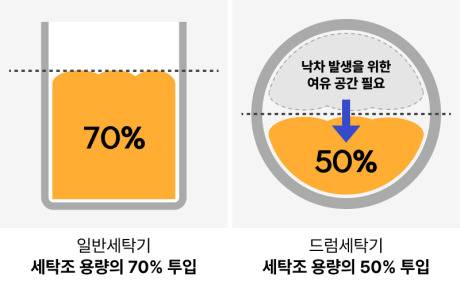 일반세탁기는 옷감을 회전시키며 발생하는 마찰로 때를 빼내지만 드럼세탁기는 빨래가 위로 올라갔다가 떨어지는 낙차를 활용하여 때를 빼내기 때문에 세탁물이 떨어질 수 있는 공간이 확보되어야 합니다.