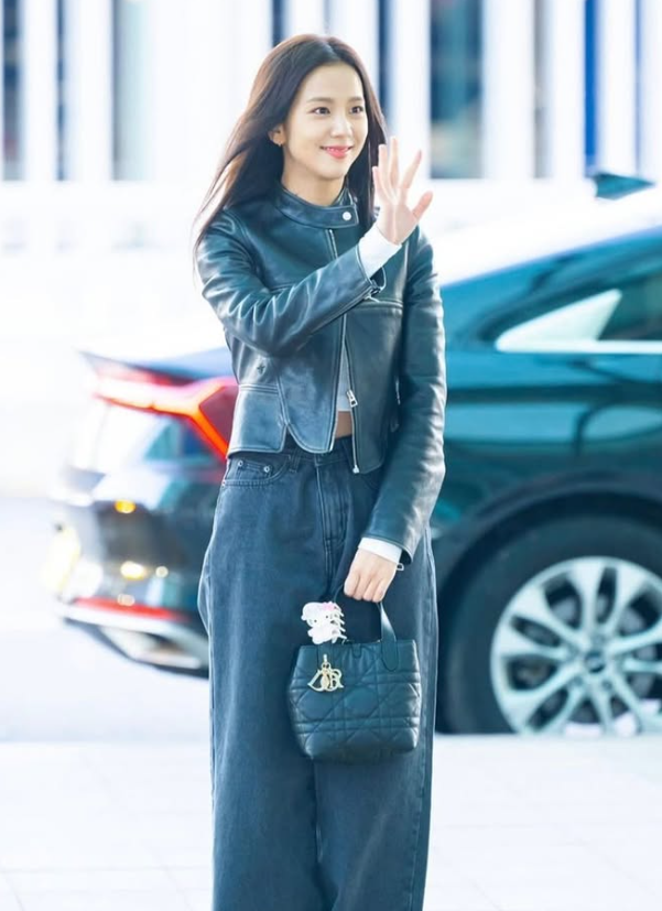 이 날 그녀는 크롭 가죽 재킷에 와이드 핏 블랙 데님팬츠를 입어 시크한 올블랙 스타일링을 선보였다.