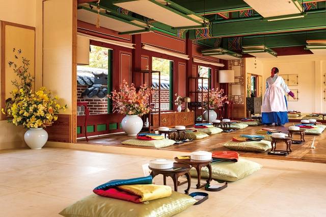 예약자 확인을 마치자 차비(差備) 복식을 한 진행 요원이 안내에 나섰습니다. 차비는 조선시대 궁중의 주방에서 실무를 담당한 하위 계급의 나인입니다. 옥빛 저고리에 푸른 치마를 입은 나인들이 왕을 모시듯 예를 갖춰 체험객들을 자리로 안내했습니다.