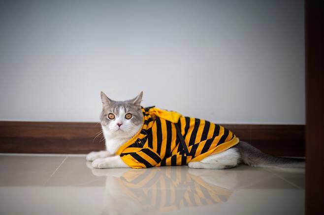 고양이가 옷을 입게 되면, 움직임이 매우 둔해져요. 사냥 본능을 지니고 있는 고양이는 움직임이 둔해지면 생존의 문제로 인식합니다. 또한, 높은 곳을 오르고 내리는 과정에서 옷이 모서리 등에 걸려서 사고로 이어질 가능성도 높아요.