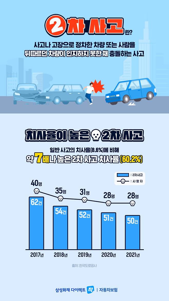 2차 사고가 고속도로에서 발생했을 경우, 인명피해 등 큰 사고로 이어질 수 있어 주의가 필요합니다. 실제로 한국도로공사 통계 자료에 따르면 2차 사고의 치사율은 60.2%로 일반 사고(8.6%)에 비해 약 7배나 높은 치사율을 보이고 있습니다. (‘17년~’21년 기준)