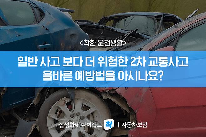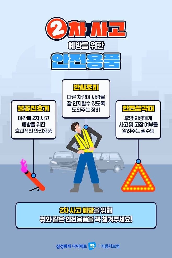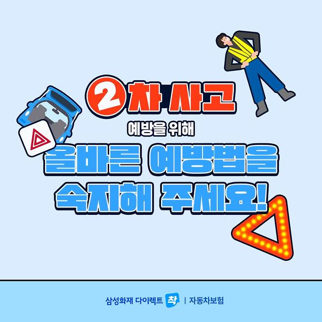일반 사고보다 위험성이 더 큰 2차 사고! 때문에 예방이 무엇보다 중요합니다. 2차 사고 예방을 위한 안전용품을 갖추는 것은 물론, 사고 발생 시 당황하지 않고 올바른 방법으로 대처하는 것 잊지 마세요!