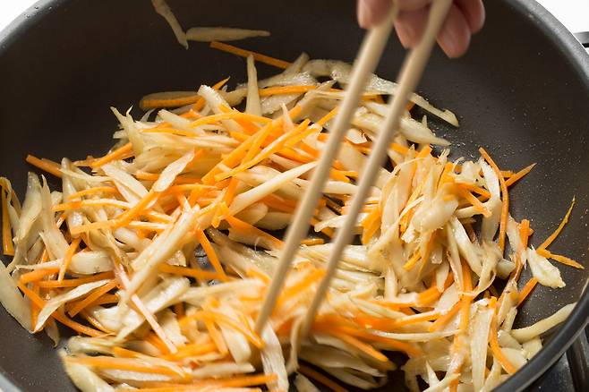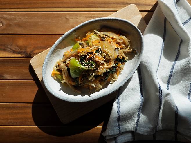 혈당이나 열량 부담 없이 잡채를 즐기고 싶다면 ‘주인공’을 교체하는 것도 방법이다. 당면과 소고기를 밀어내고, ‘우엉’을 주무대에 세우는 조리법이다. 비건(vegan·완전채식) 요리연구가인 소나영 한국디톡스& 로푸드협회 대표는 “당면 대용으로 우엉을 길게 썰어 넣으면 잡채의 열량을 낮출 수 있다”며 “우엉의 풍부한 식이섬유와 비타민 등의 영양소가 보충되고, 아삭한 식감도 즐길 수 있다”고 말했다.