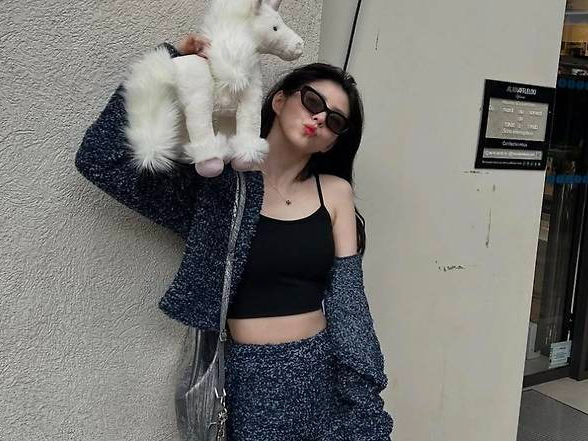 실버 메탈릭 숄더백으로 포인트를 준 것도 눈에 띄었습니다. 반짝이는 소재는 트위드 특유의 텍스처와 묘하게 어우러지며 한소희만의 힙한 분위기를 배가시켰습니다.