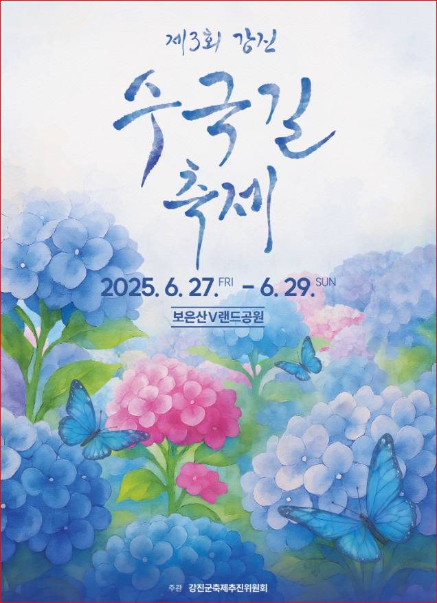 2025년 제3회 강진수국길축제는 6월 27일(금)부터 29일(일)까지 3일간 열리며, 올해의 주제는 "꽃길만 걷자"입니다.