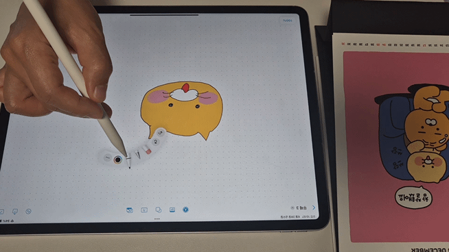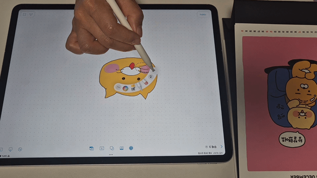 펜슬을 꾹 쥐듯 한번 누르니 ‘딸깍’하는 햅틱 반응과 함께 팔레트가 나타났다. 애플펜슬 프로에 새롭게 추가된 스퀴즈 제스처다. 팔레트에 펜슬을 가져다 대고 좌우로 훑으면 지우개, 손글씨 입력, 색칠도구, 올가미(라쏘) 도구 등이 나타난다. 도구를 이동할 때마다 ‘드르륵’하는 햅틱 반응이 손맛을 더했다. ‘춘식이 눈 사이가 너무 먼 것 같은데? 수염 위치도 위로 좀 올려야겠고….’ 여러 차례 수정을 할 때도 팔레트가 펜슬 끝이 위치한 곳에 바로 나타나니, 많이 움직이지 않고 필요한 도구를 꺼내 쓸 수 있어 좋았다.