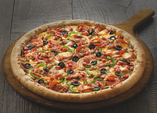 -치즈 → 양파, 피망, 버섯 → 페퍼로니 → 블랙 올리브 순으로 토핑 올리기.