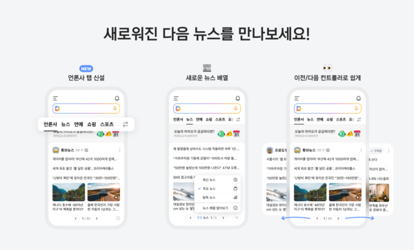 다음은 뉴스 탭에서 이용자가 이 시각 꼭 알아야 할 중요한 이슈를 한눈에 파악할 수 있도록 '주요 뉴스' 배열 방식을 추가했다. 시간대별로 언론사가 많이 다루는 뉴스를 기반으로 실시간 주요 이슈를 보여준다. 기존 제공하던 최신순∙개인화순∙탐독순 세 가지 뉴스 배열 방식에 더해 이용자의 선택권을 확대했다.