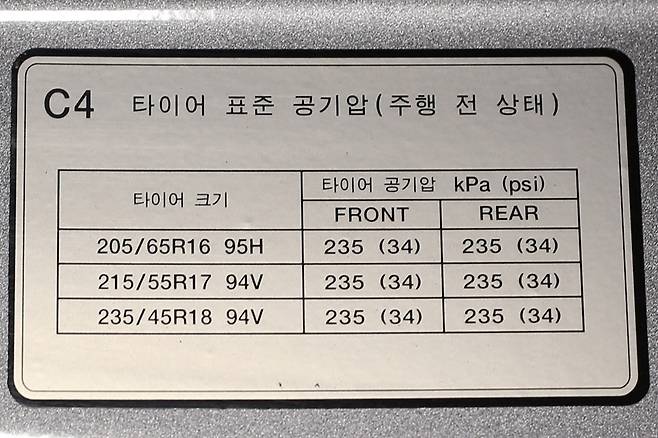 최선의 방법은 네 바퀴 모두 정격 공기압을 맞추는 것이다. 흔히 타이어 측면에 적힌 최대 공기압의 80%를 주입하면 된다는 말이 있으나 가장 정확한 건 운전석 쪽 B 필러 하단에 있는 스티커다. 제조사에서 권장하는 수치를 준수하는 것이 승차감, 주행 안정성 측면에서 가장 이상적일 것이다.