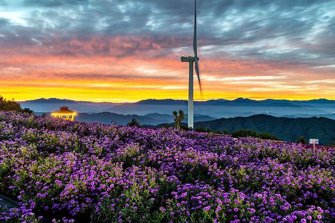 경남 거창군 감악산 자락에 위치한 ‘별바람언덕’은 해발 900m 고지에서 만나는 특별한 여행지입니다. 황무지였던 이곳은 이제 감국, 구절초, 샤스타데이지, 억새, 소국 등 다양한 꽃들이 사계절을 물들이는 고원 꽃밭으로 변모했어요. 그중에서도 가을에 만나는 보랏빛 아스타 국화는 이 언덕의 백미입니다.