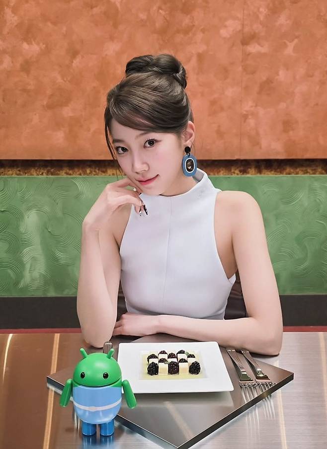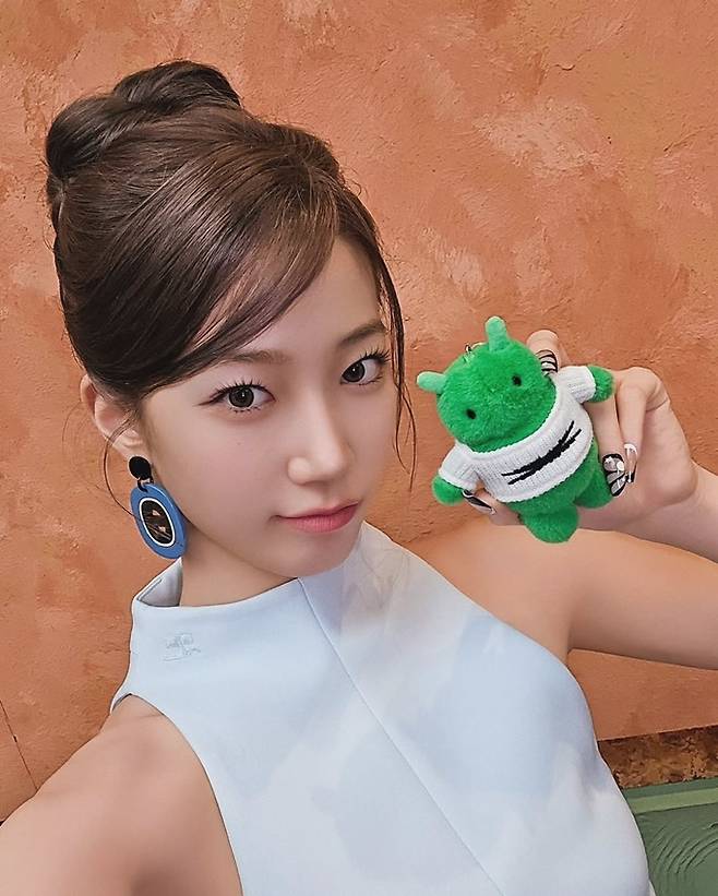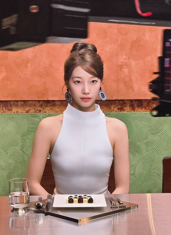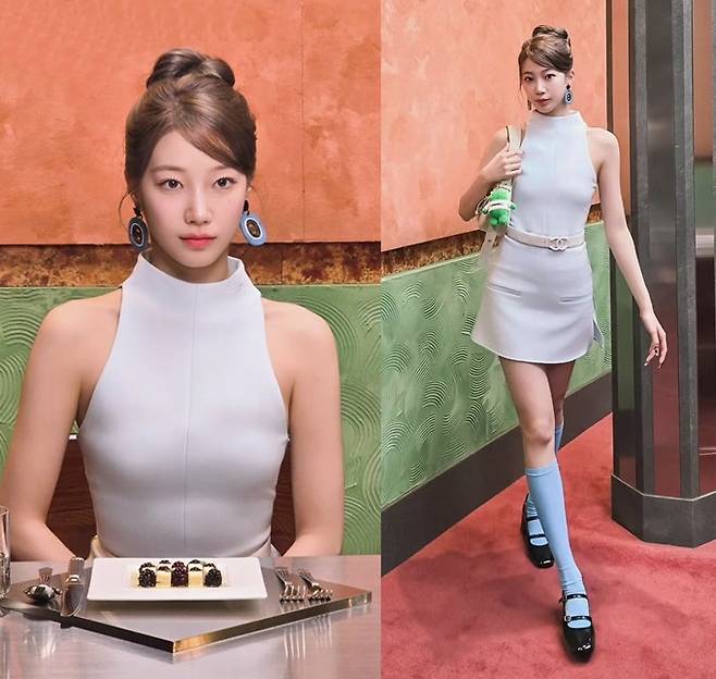 또 단아하고 귀여운 얼굴에 동그란 이어링를 하고 하늘색 니하이 삭스와 블랙 슈즈를 매치해 귀여우면서도 럭셔리한 스타일을 완성했다.