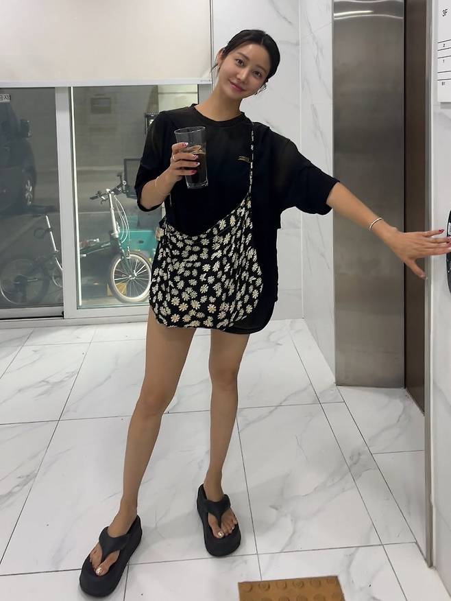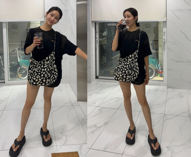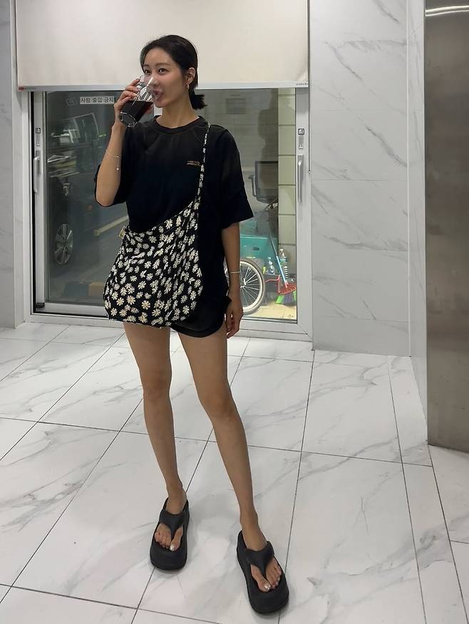 커다란 플립플랍 샌들과 플라워 패턴의 크로스백으로 편안하면서도 개성 있는 룩을 연출했으며, 그 속에서도 길고 늘씬한 각선미가 단연 돋보였다.
