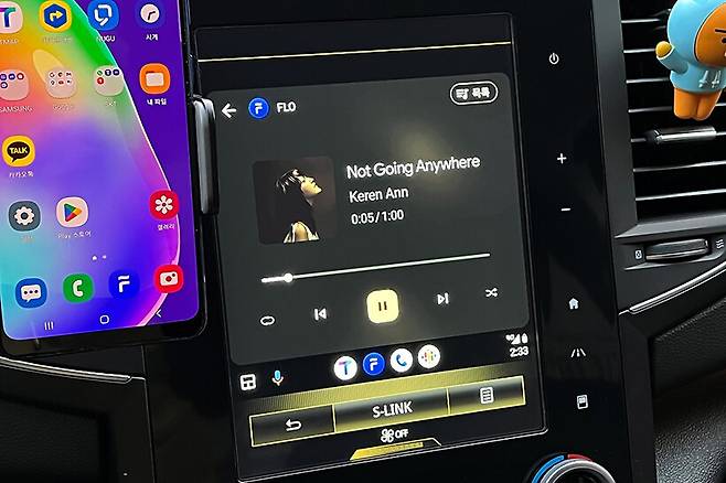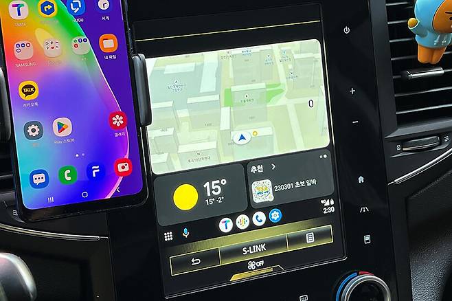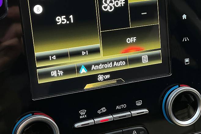 이렇게 설치가 완료되면 차량에 탑승해 시동을 켜면 유선으로 스마트폰을 연결했을 때와 마찬가지로 차량 순정 내비게이션 화면에 안드로이드 오토 버튼이 켜진다.