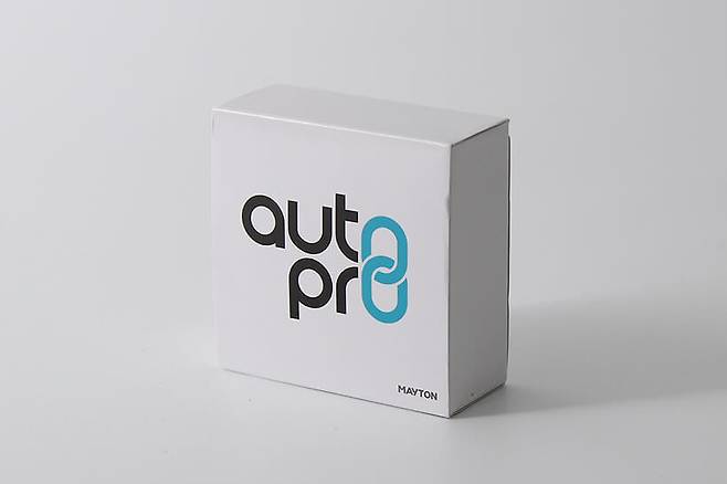 메이튼 무선 안드로이드 오토 오토프로는 자그마한 상자에 담겨있다. 흰색 바탕 박스의 앞면에는 오토 프로 로고가 인쇄되어 있고, 제품의 이미지 등은 담고 있지 않다.