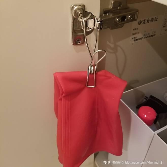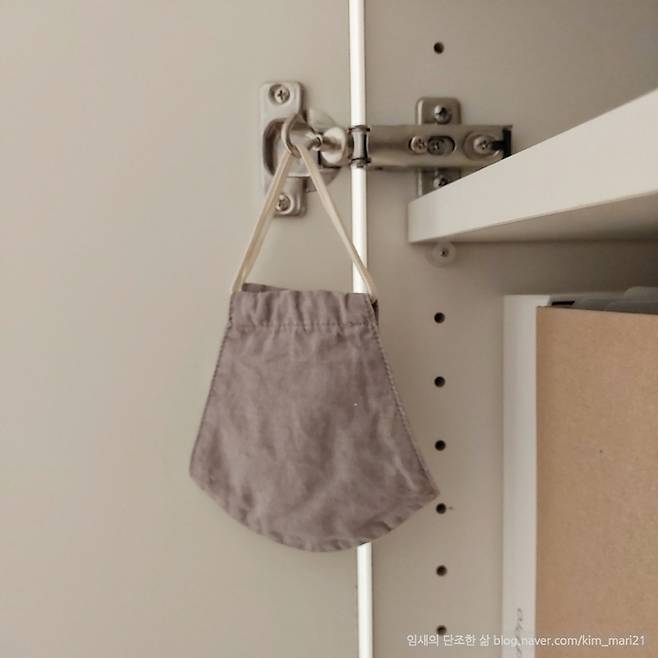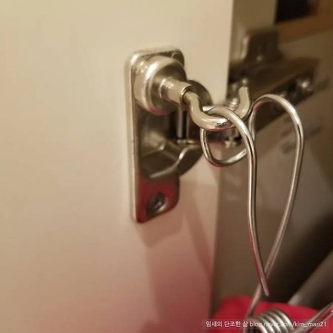 수납장 안 경첩에도 임시 마스크 걸이를 설치해 두고 가끔 현관에 마스크가 없을 때 여기서 신속하게 꺼냅니다.