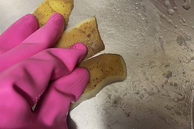 감자껍질의 녹말 성분이 찌든 때를 잘 흡착하거든요. 저 같은 경우 싱크대 청소할 때 사용하는데요. 마침 기름기 있는 음식을 먹어 싱크대가 지저분했어요.