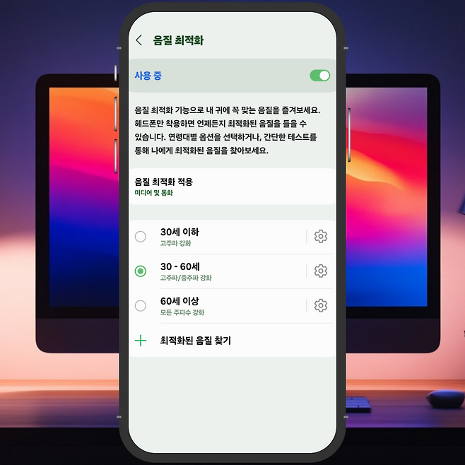 갤럭시에서는 '최적화된 음질 찾기' 기능을 제공하여 사용자의 청각 특성에 맞춘 맞춤형 사운드를 설정할 수도 있는데요.