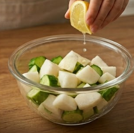 ▶ 볼에 담고 레몬즙을 뿌린 뒤 가볍게 섞어주세요
