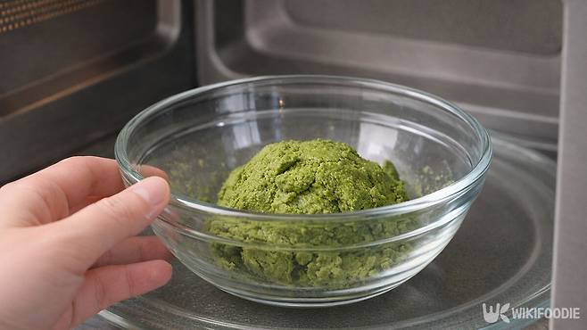 5. 찹쌀가루와 녹차 물을 섞어 전자레인지에서 총 4분 조리한다.