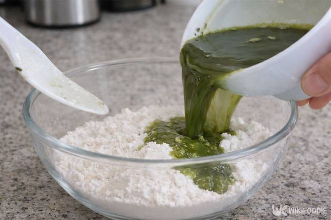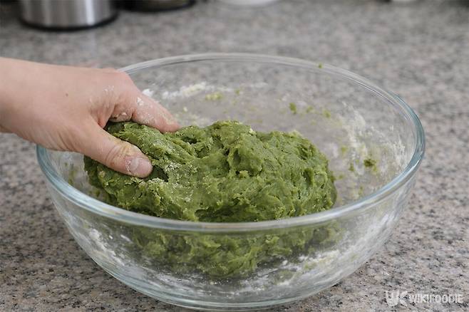 찹쌀가루에 설탕과 소금을 섞고, 녹차 가루를 푼 물을 부어 반죽한다. 그릇에 랩을 씌우되 공기가 통하도록 틈을 남기고 전자레인지에서 3분간 돌린다. 한 번 꺼내 골고루 섞은 뒤 다시 1분 더 조리한다.