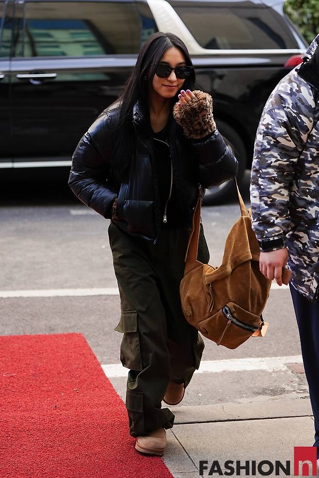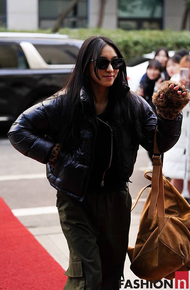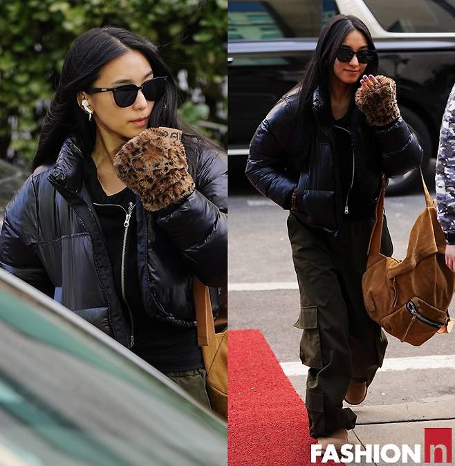 이날 보라는 통이 넓은 카키 카고 팬츠에 블랙 광택 패팅을 입고 호피 핸드워머와 블랙 선글라스를 매치해 힙한 출근룩을 선보였다.