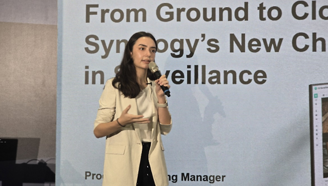 캐서린 장 시놀로지 마케팅 매니저가 22일(현지시간) 대만 타이베이 난강 전시홀에서 진행된 미디어 세션에서 차세대 영상 모니터링 솔루션 C2 서베일런스 소개하며 이같이 말했다.