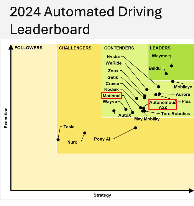 14일 글로벌 컨설팅업체 가이드하우스(Guidehouse)에 따르면 최근 발표한 '2024년 자율주행 리더보드' 보고서에서 에이투지는 11위를 기록하며 현대자동차그룹의 자율주행 관계사 '모셔널(15위)'을 넘어섰다. 에이투지는 2023년 13위에서 두 계단 상승, 추격(챌린저) 그룹에서 경쟁(콘텐더) 그룹으로 올라섰다. 반면 모셔널은 지난해 5위에서 올해 15위로 급락하며 자율주행 기술 경쟁에서 고전하는 모습을 드러냈다.