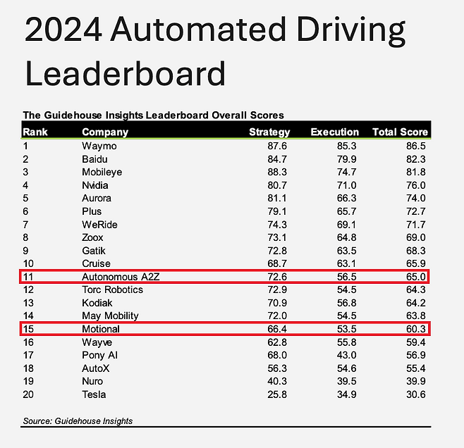 가이드하우스는 매년 자율주행 기술 개발 기업들을 평가하며 순위를 발표한다. 구글의 자율주행 관계사인 '웨이모'는 올해 리더보드에서 1위를 차지하며, 3년 만에 '왕좌'를 탈환했다. 이어 중국의 빅테크 '바이두', 이스라엘 자율주행 테크기업 '모빌아이', 세계 최대 인공지능(AI) 반도체 기업 '엔비디아' 등이 상위권에 이름을 올렸다.