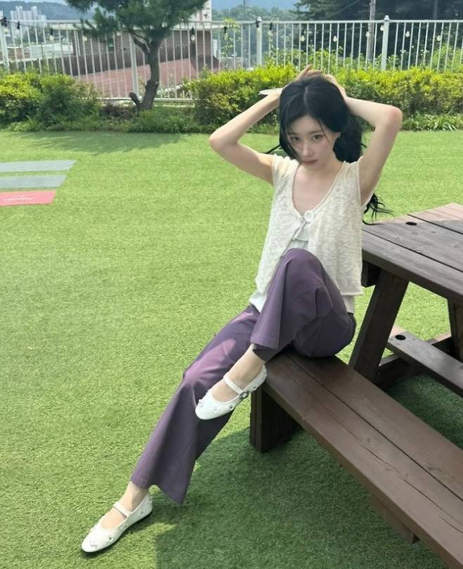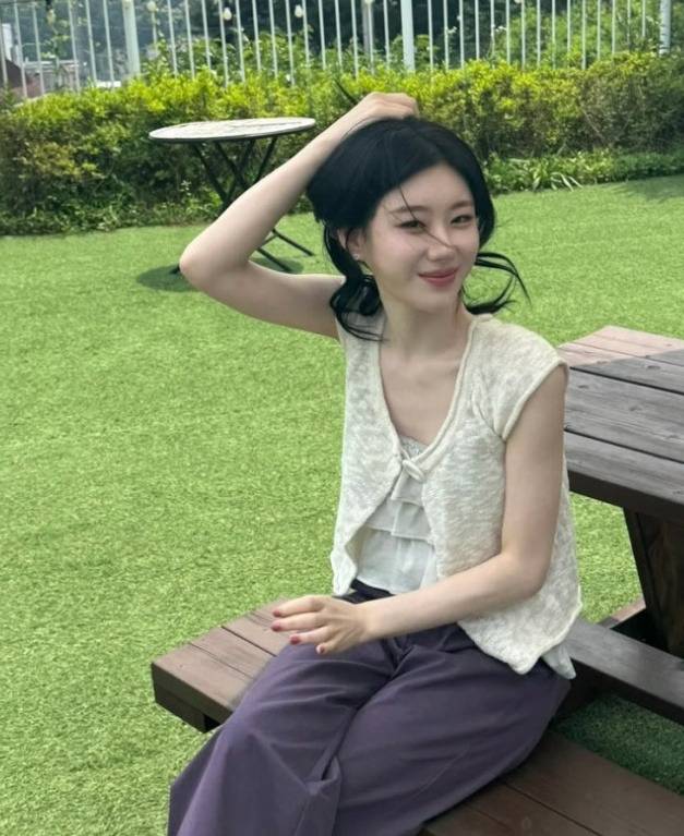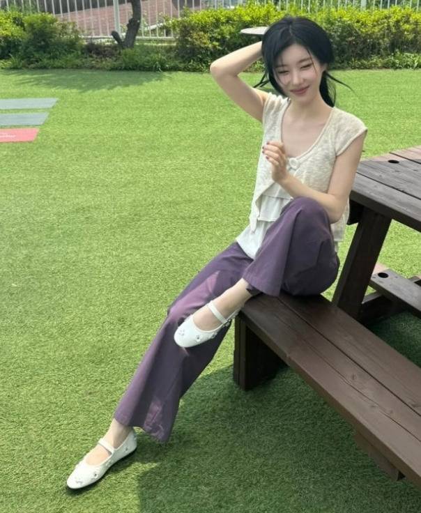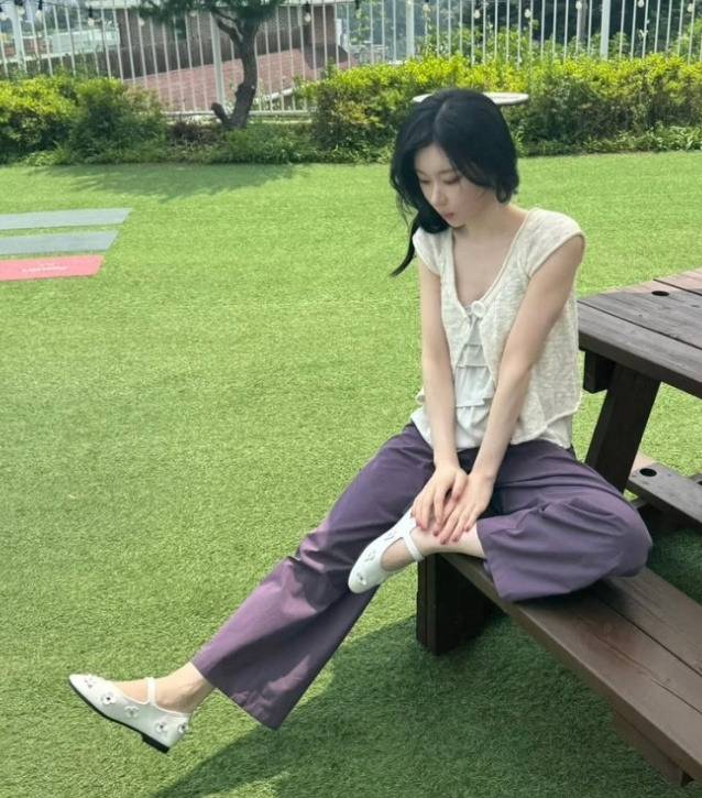 전체적으로 부드러운 파스텔톤 색감과 채령 특유의 청순하고 단정한 분위기가 어우러져 누구나 따라 하고 싶어지는 코디입니다. 특히 흔하지 않은 보라색 팬츠는 여름에 포인트를 주기 딱 좋은 아이템이죠!