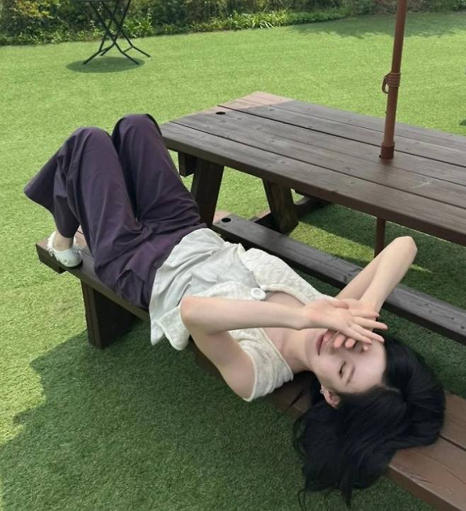 잔디밭에 앉아 여유를 즐기는 채령의 모습은 그야말로 ‘여름 데일리룩’의 정석입니다. 그녀가 선택한 아이템들을 하나씩 살펴볼까요?